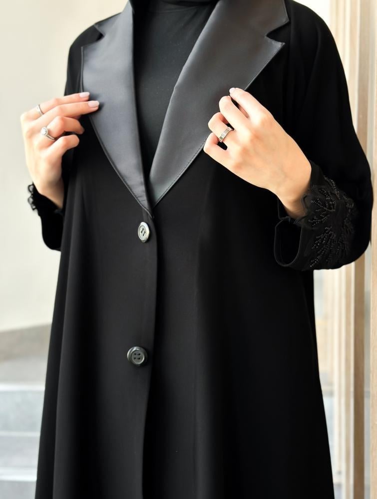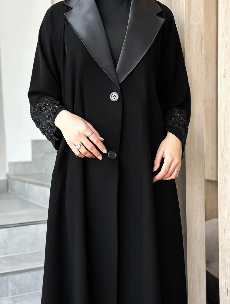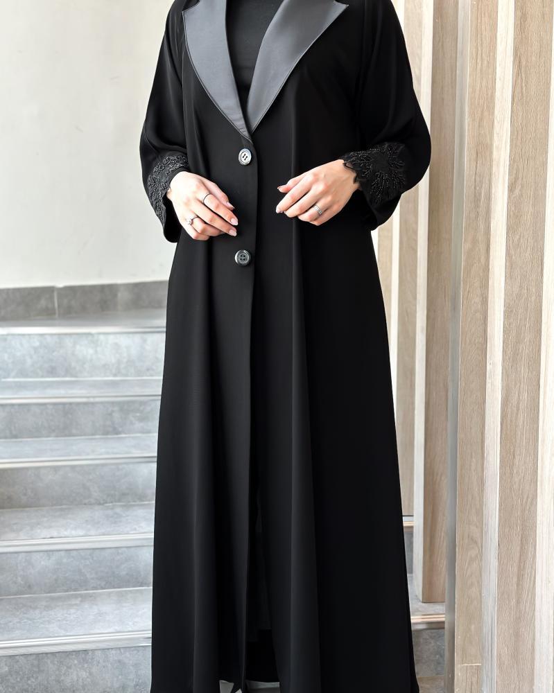 • تم تصميم العباية بشك يدوي على الكم وياقة جهة الصدر يضيفان لمسة فنية أنيقة.