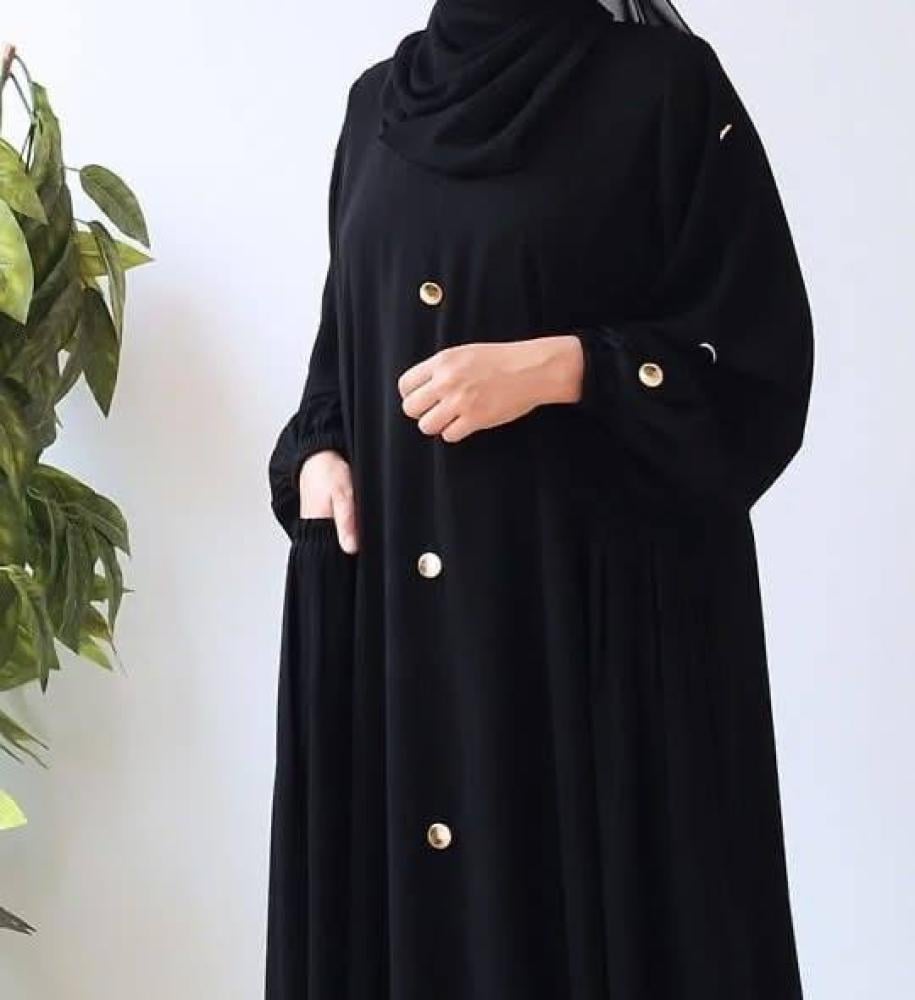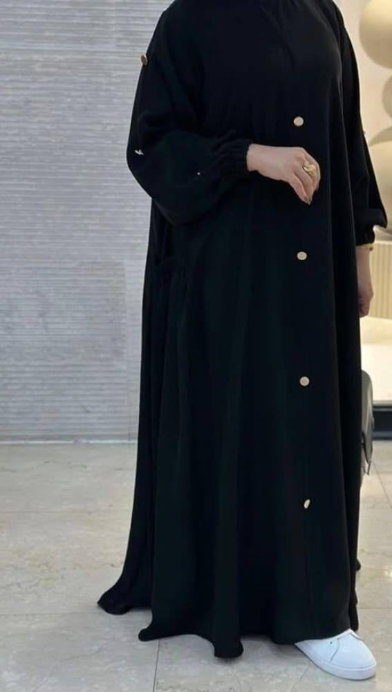 - تفاصيل أزرار أمامية تمنح العباية مظهرًا أنيقًا بلمسة فنية راقية.
